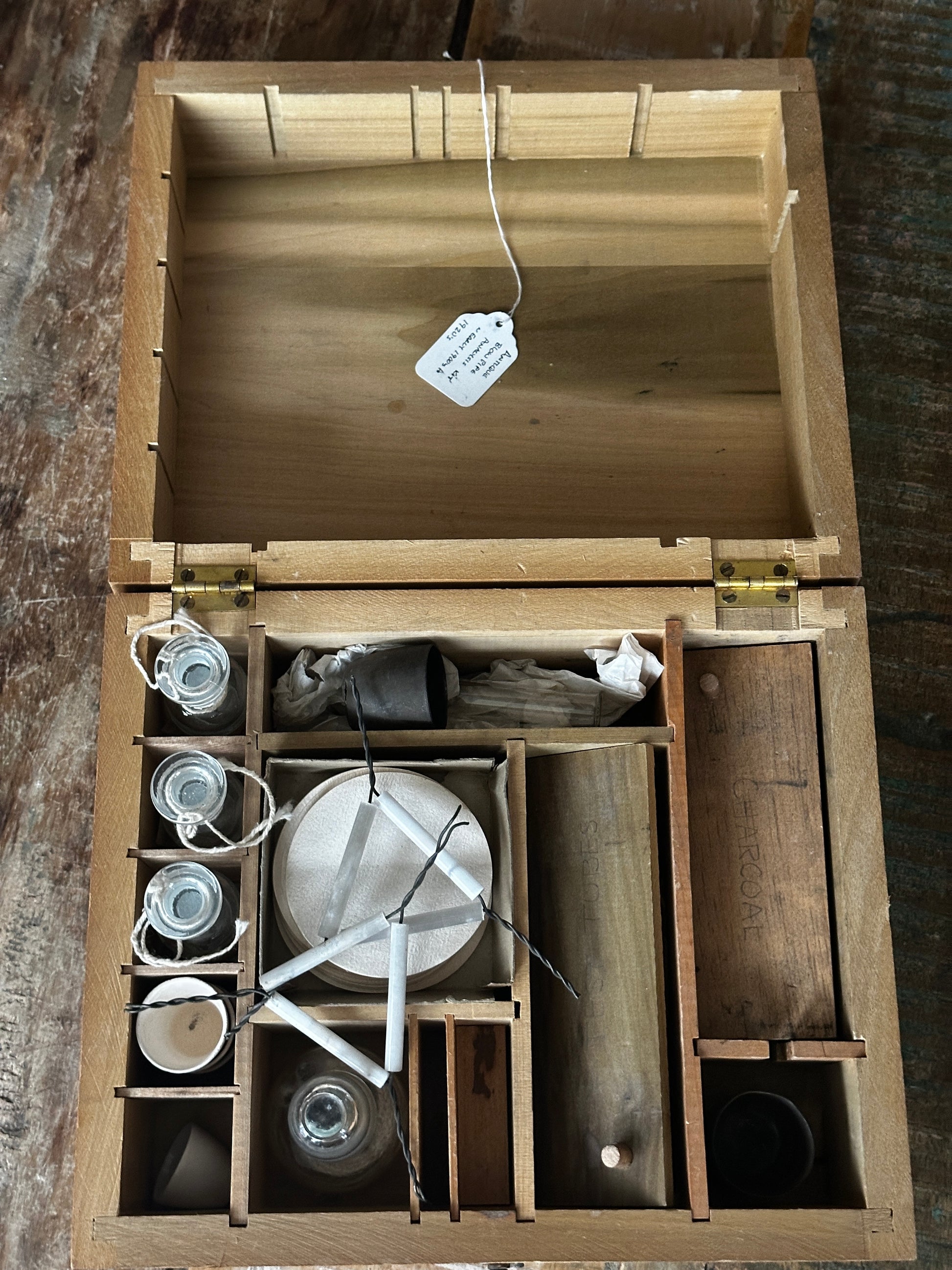 This kit is probably from the 1920's to 1940's. It was a professional kit. Parts are missing but the essence is there. Included is the steel mortor & pestle, test tubes, charcoal blocks, 3 glass acid bottles (they appear to be unused), ceramic crucibles, copper crucibles, filter papers, heat resistant wire triangular holders, and an alcohol lamp. All in a wooden box.