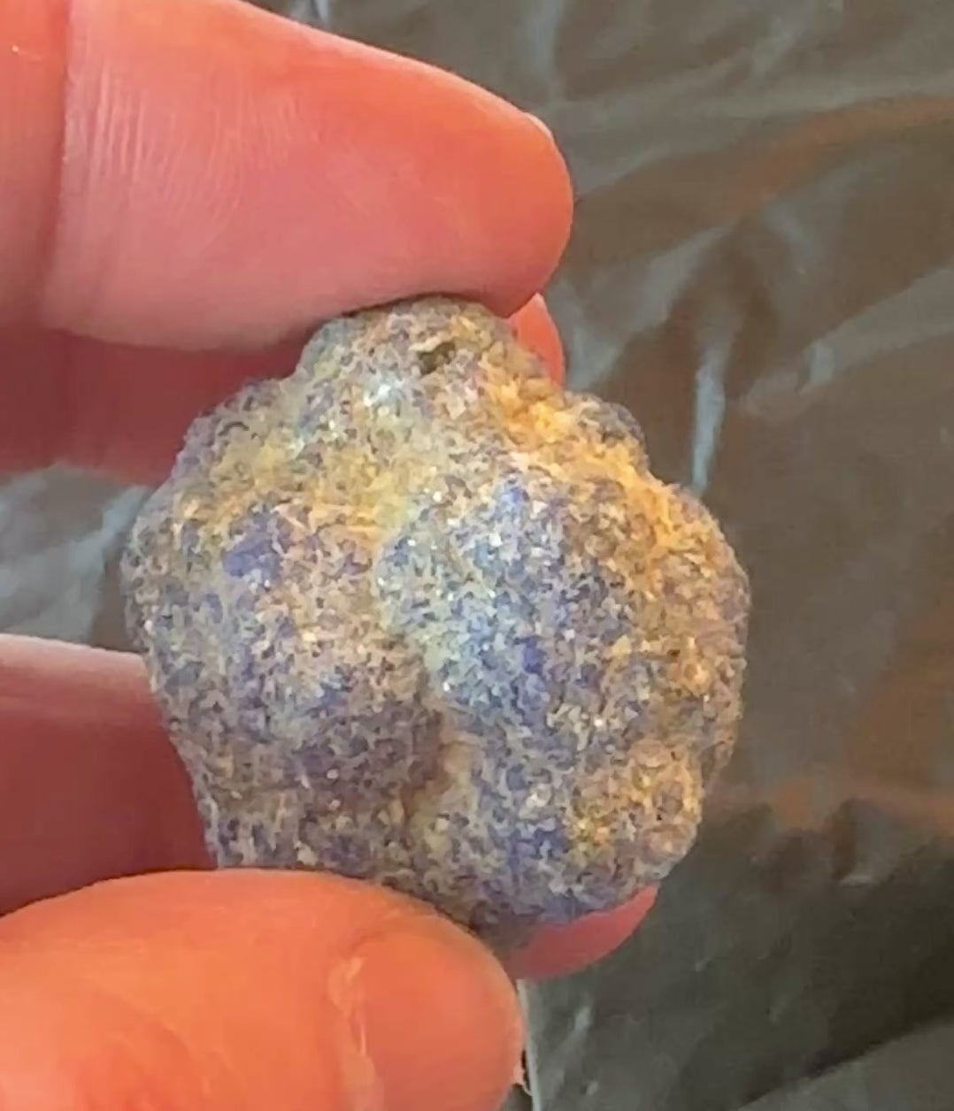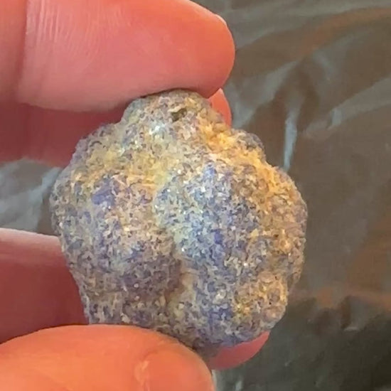 A ball made up of smaller balls of azurite, often called blueberries. Not oiled like a lot of them. Since they have started strictly limiting collecting here, the prices of specimens from here have gone way up. Some of these blueberries have hollow centers and CAN contain crystals of azurite, malachite, or brochantite-it's always a gamble.