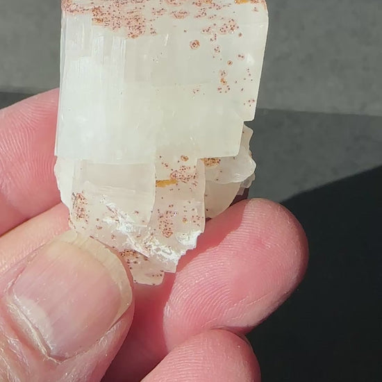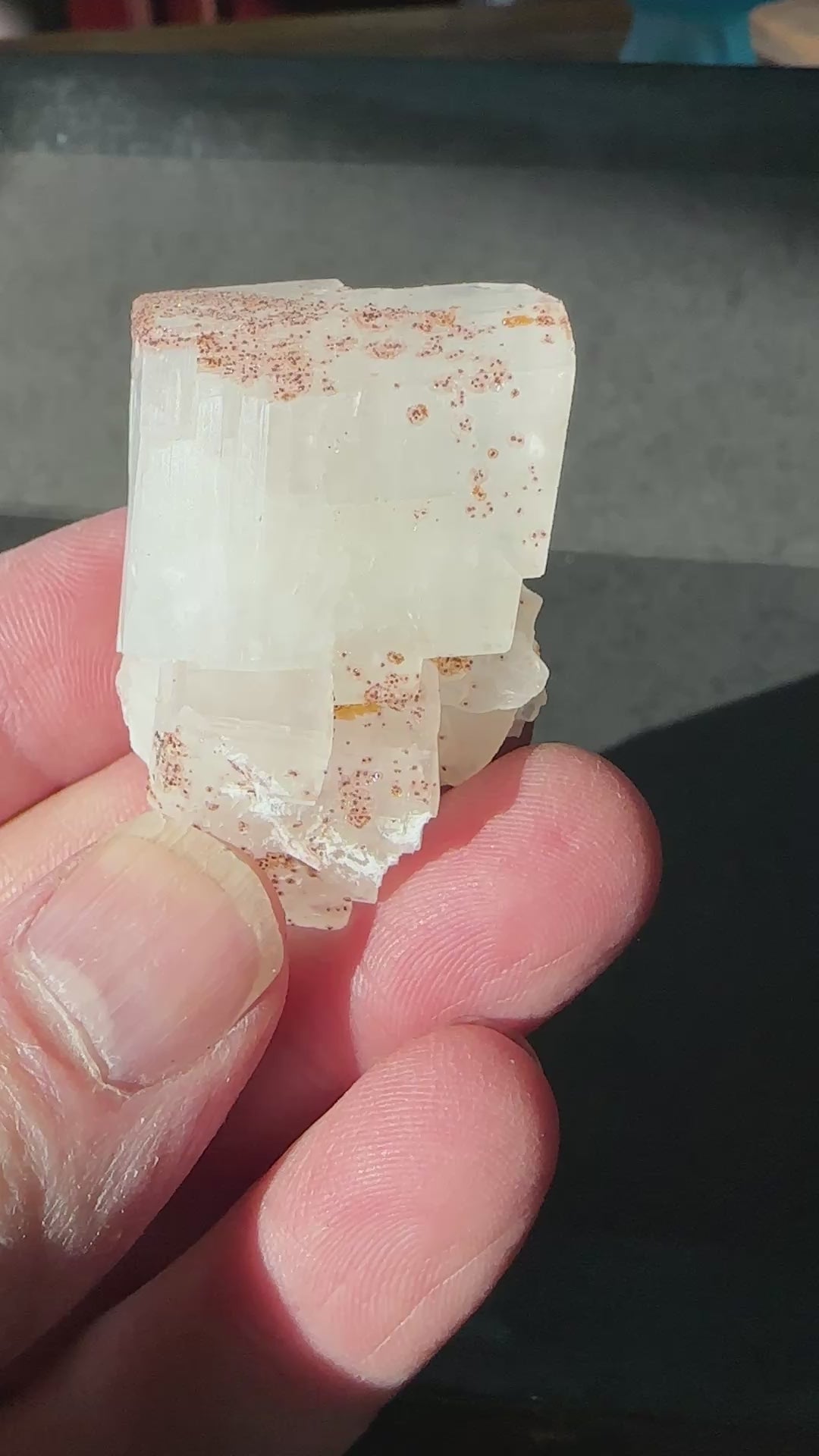 This is from the center of a large septarian nodule. A single calcite crystal with rusty micro pyrite crystals dusting the termination. A unique specimen.