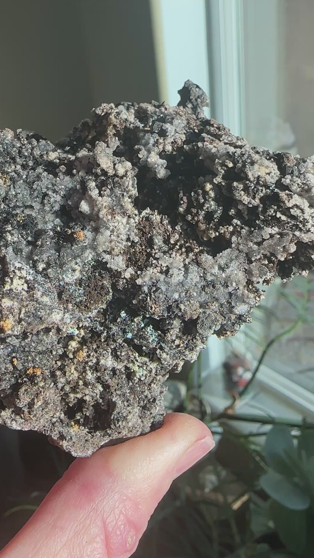 An unusual pseudomorph of garnets into magnetite. Grossular garnets are common in the metamorphic zones at this mine so I have always assumed they were grossular garnets in their previous life. The sparkly material is hemimorphite and the blue is aurichalcite.