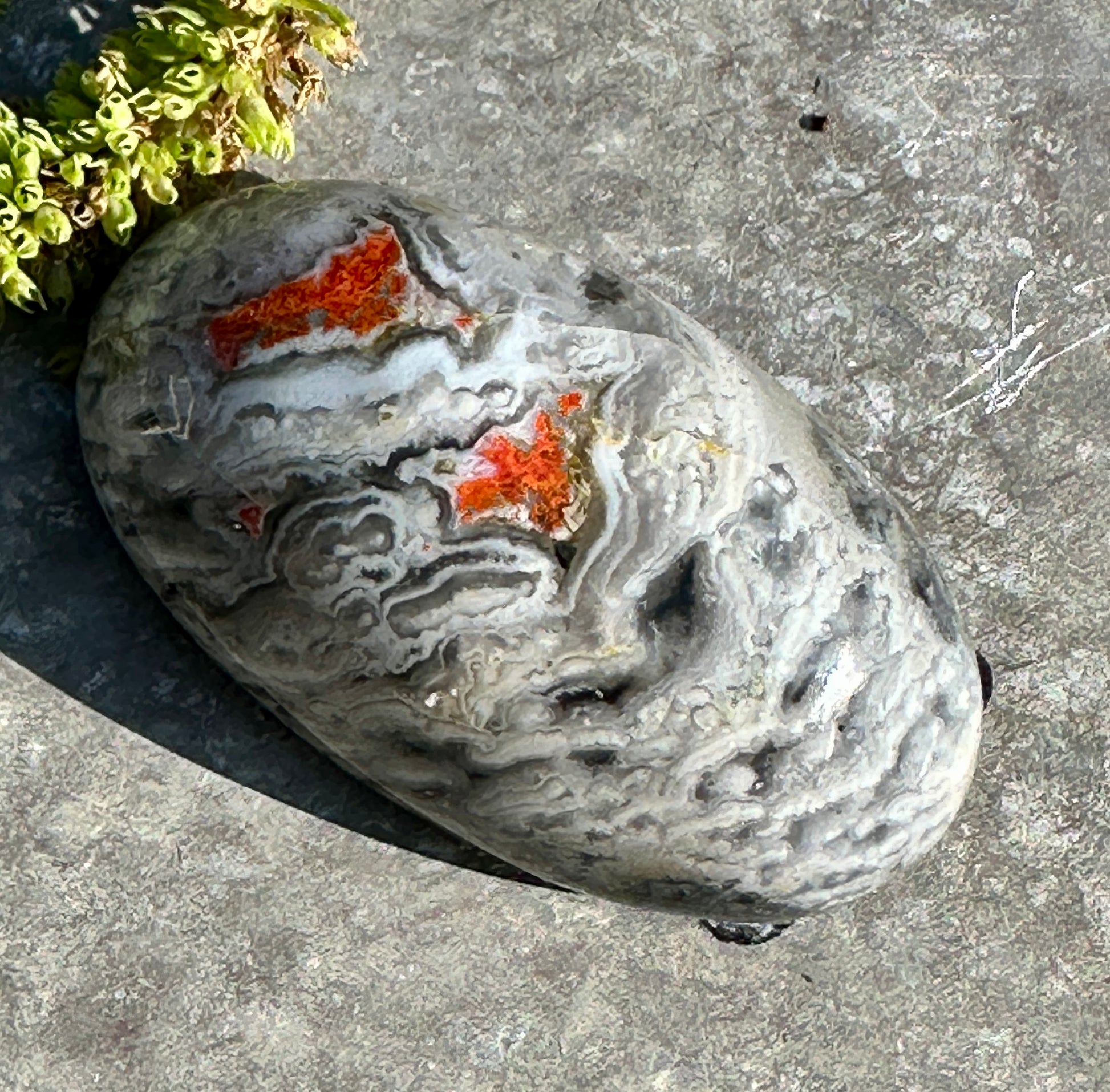A thick cab of myrickite. Myrickite is any chalcedony (agate) that has cinnabar in it. This cab is thick and has a small dome on the back. Polished all around. Myrickite is very rare and only comes from a few places in the world. Not to be confused with "chicken blood" stone from China-that's a cinnabar stained serpentine.