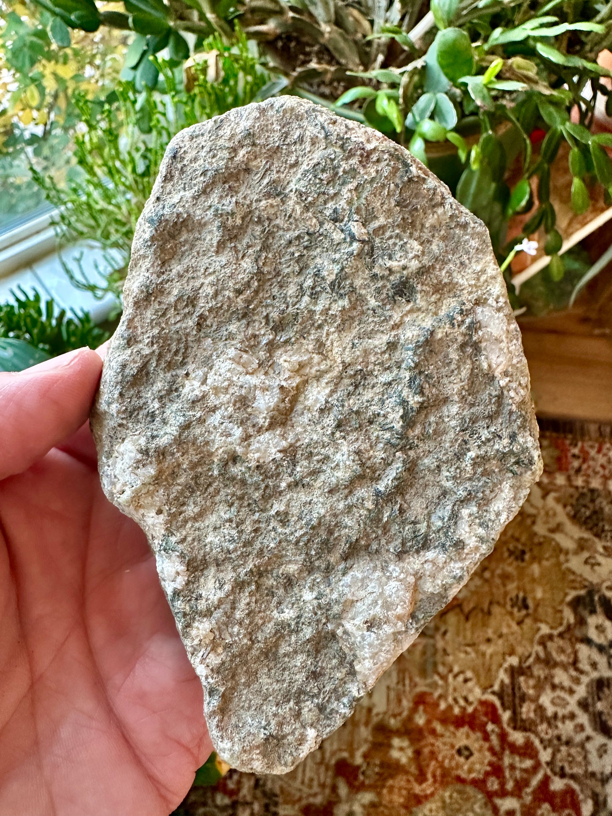 Here is scheelite in a gray quartz and greenish actinolite. The host rock is metasomatically altered amphibolite. This specimen was collected in 1995 by Ralph Dames.